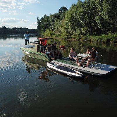 Самостоятельно плавсредство, когда плот приводится в движении мотором малой мощности. Для этого дополнительно устанавливается съемный транец, и наши испытания с электромотором HDX 32L показали успех такой затеи.